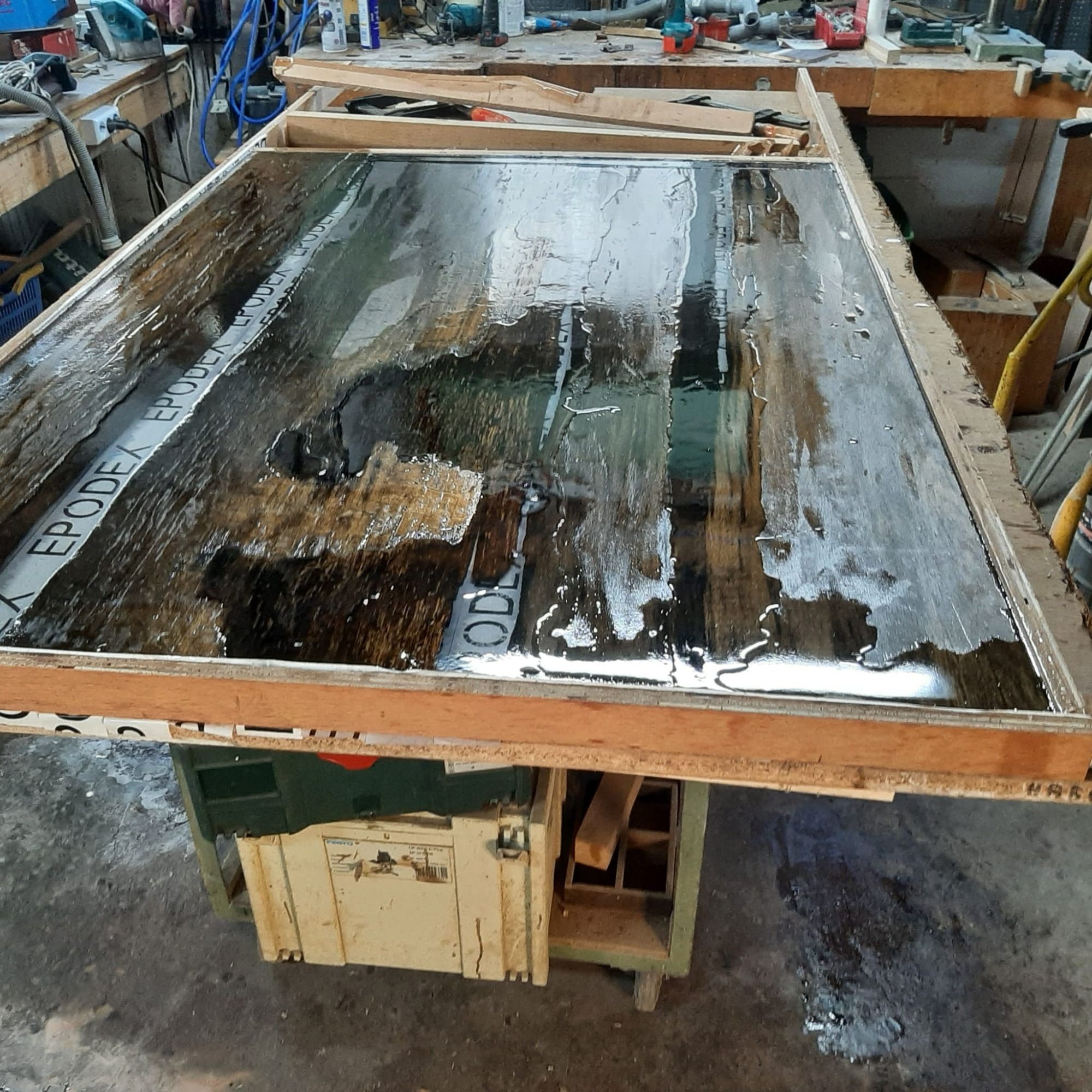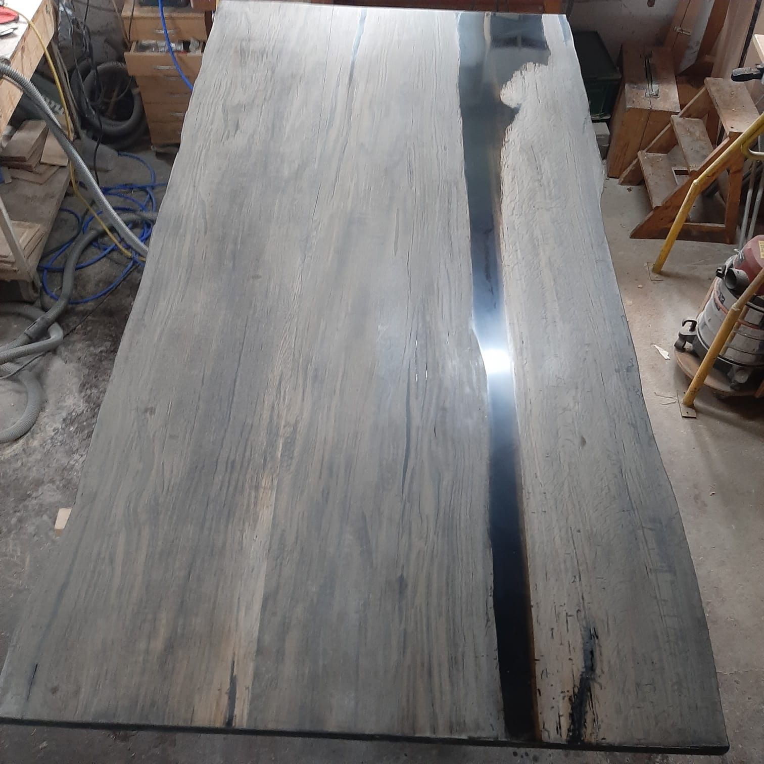 Beim zweiten Anlauf haben wir mehrere Bretter Mooreiche mit transparentem Epoxidharz umgossen. Dieses Mal kann man deutlich durch die Tischplatte schauen. Die Platte hat die Maße 133 x 96 x 4 cm. Ein Tischgestell gibt es im Moment noch nicht.